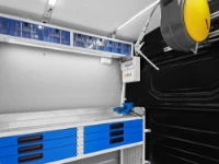 - un établi recouvert en acier pour une résistance maximale, placé contre la paroi séparation cabine, accessoirisé avec un étau métallique et illuminé par un plafonnier LED; l ‘établi repose sur une série de six tiroirs métalliques avec tapis antiglisse et séparateurs internes, tandis que le compartiment ouvert au sol, avec l’aide de crochets et de sangles, devient un rangement idéal pour le compresseur et l’onduleur. La zone sommitale est entièrement occupée par une série de conteneurs amovibles transparents de deux mesures différentes. Sur la paroi séparation cabine est installé le tableau électrique avec les boutons d’allumage ;